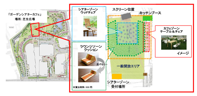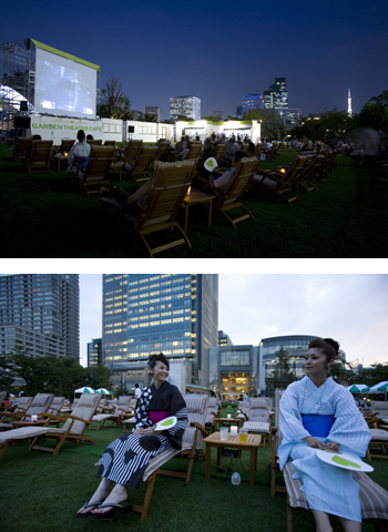 東京ミッドタウンは2008年6月4日、芝生広場で夕涼みができる「ガーデンシアターカフェ」を今夏、期間限定で開設すると発表した。夕方から日没まではオープンカフェとなり、日没後は映画など鑑賞できるオープンシアターとする。開催期間は7月18日~8月24日で、雨天・荒天時は営業しない。